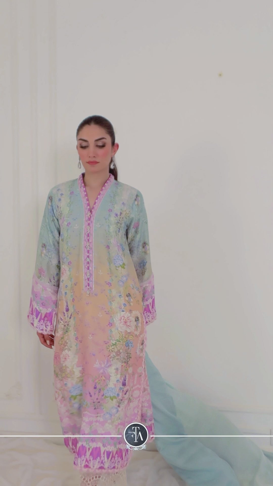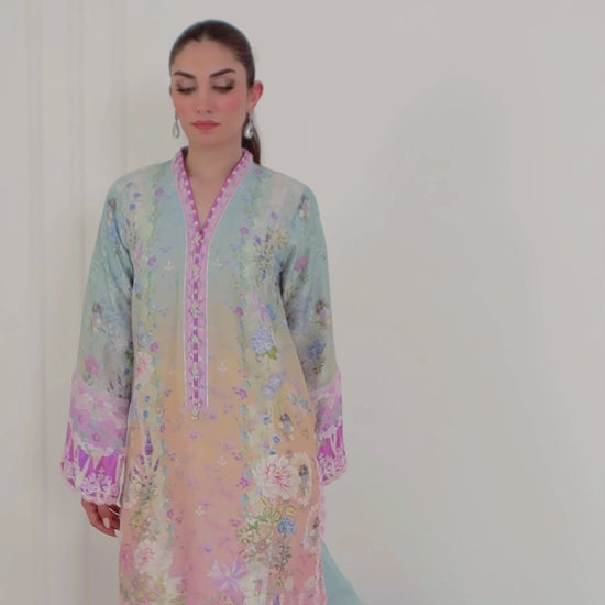 Infused with the signature FTA aesthetic, our new prints have the perfect pastel hues to make your heart skip a beat!! Cut from sumptuous raw silk, the shirt is given a striking ombre treatment, with a gorgeous ice blue that flows seamlessly into an irresistible peachy tone and then lavender. Whimsical florals bloom daintily all over the shirt, making this an absolute must have. The relaxed, much loved silhouette has a universally flattering neckline, adorned with delicate hand-made floral motifs, pearls and sequins, add an easy timeless elegance. A coordinating pure medium silk dupatta, in ice blue brings the look together with graceful flair. Pair yours with our embroidered cutwork pants as shown.