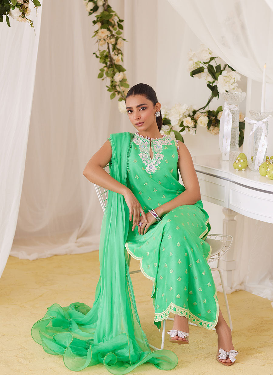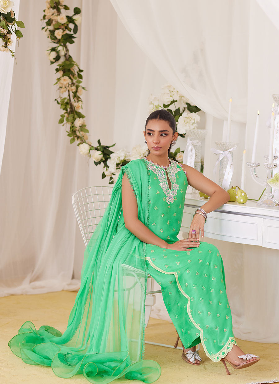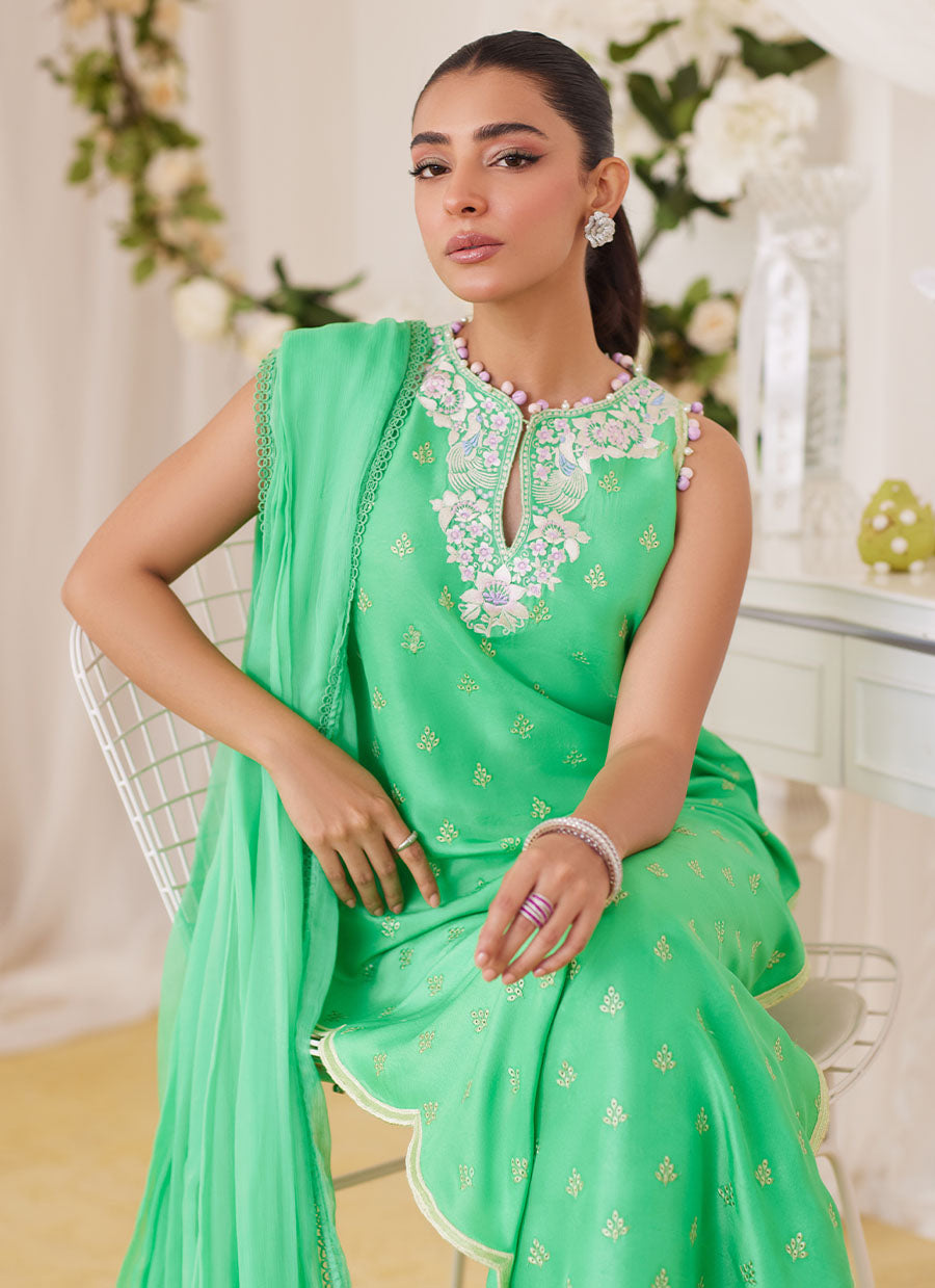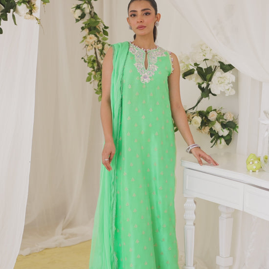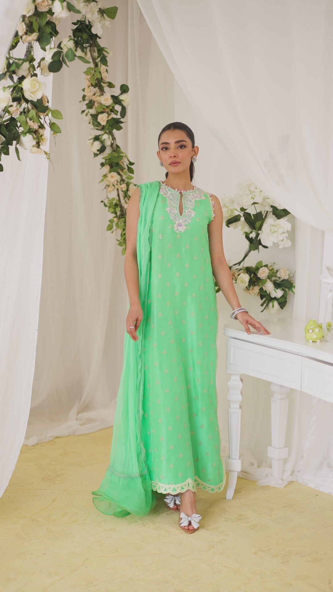 A captivating green hue, to make you stand out amongst the crowd. Cut from pure, sumptuous silk, this shirt is sure to become your forever favorite! This outfit is richly embroidered with silk thread work motifs all over. A universally embellished neckline and signature FTA detailing makes this ensemble an absolute must have! Delicate scalloped embroidered borders add the perfect amount of glamour. The elegant green dupatta completes the look gracefully. Pair yours with our matching embroidered pants (as shown) and statement studs for an unforgettable look!