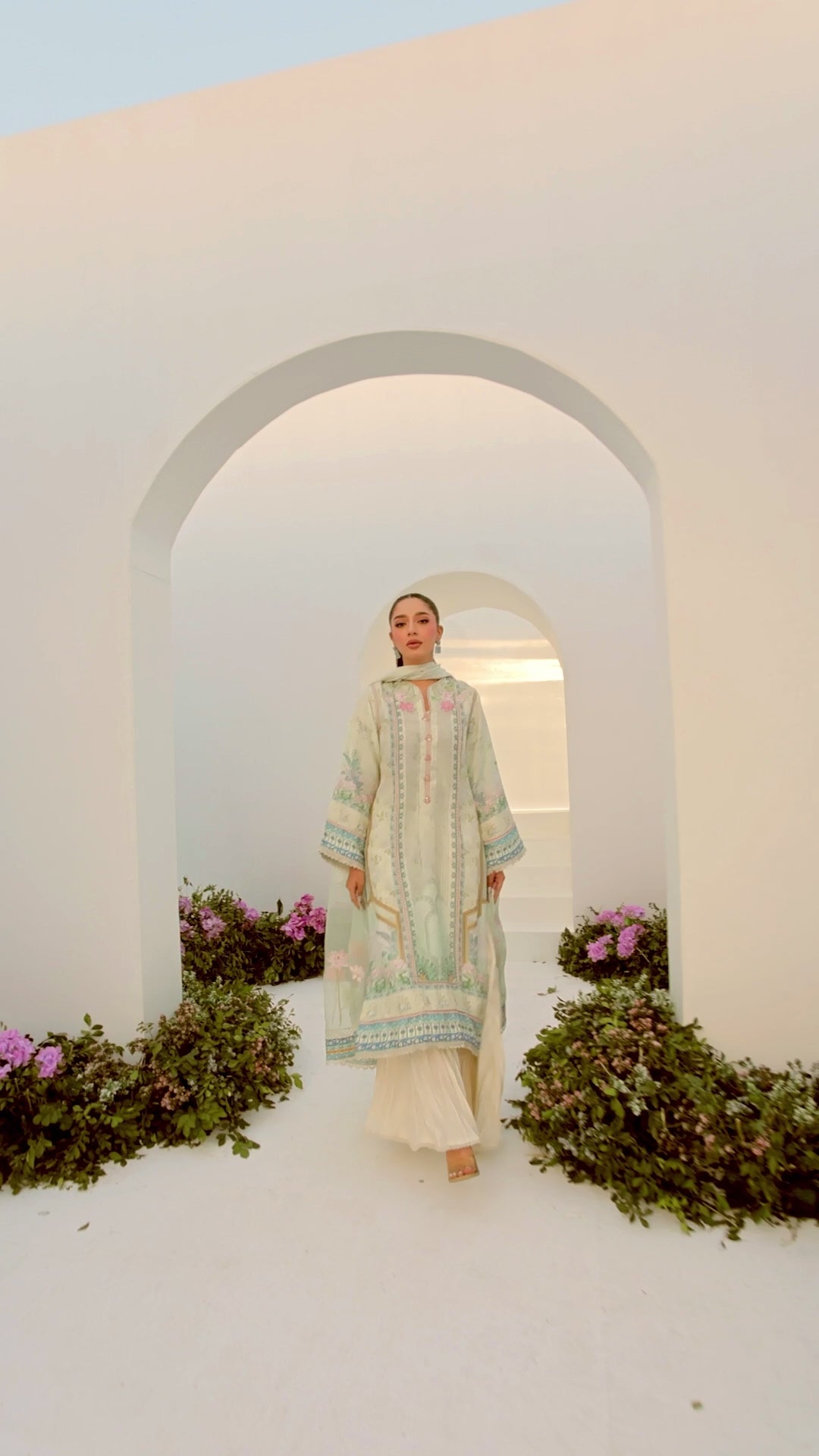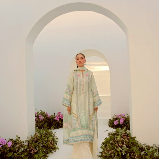 Discover elevated, refined prints created in-house with immaculate tailoring and steal the show this festive season! Brimming with signature FTA details and romance, the Turkish Aqua ensemble is impossible to resist! Cut from sumptuous raw silk, the relaxed, much loved silhouette has a ivory canvas with a tonal turquoise print all over. A universally flattering neckline, adorned with delicate hand-made floral motifs, pearls, sequins and trimmed with embroidered borders. The elegant, A-line shirt is paired with a pure medium silk dupatta in ivory, trimmed with organza embroidered with vibrant blooms. Finish the look with our pure silk, crushed pants (as pictured) and voluminous waves in your hair for the ultimate chic vibe!!