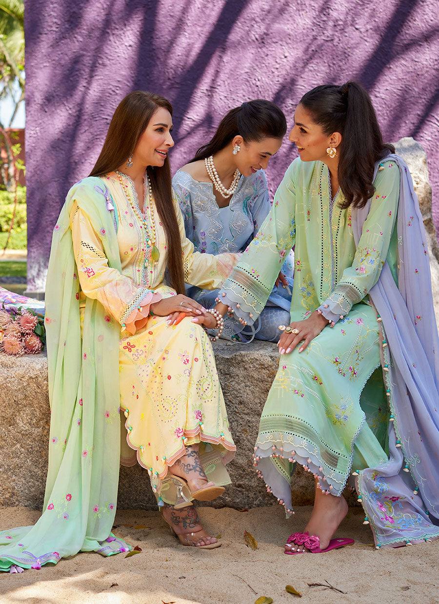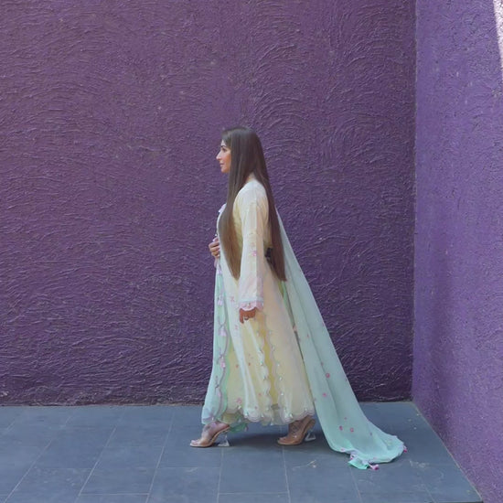 Vaia Yellow is the epitome of laid back luxe. A canvas of cool lemon yellow is adorned with the most delicate floral trellis in dreamy pastel hues. The plush airy, chiffon dupatta has charming pink blooms dotted all over making this the perfect transitional piece to carry you from day to dusk with timeless, easy elegance.