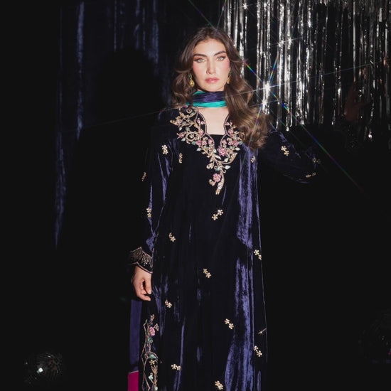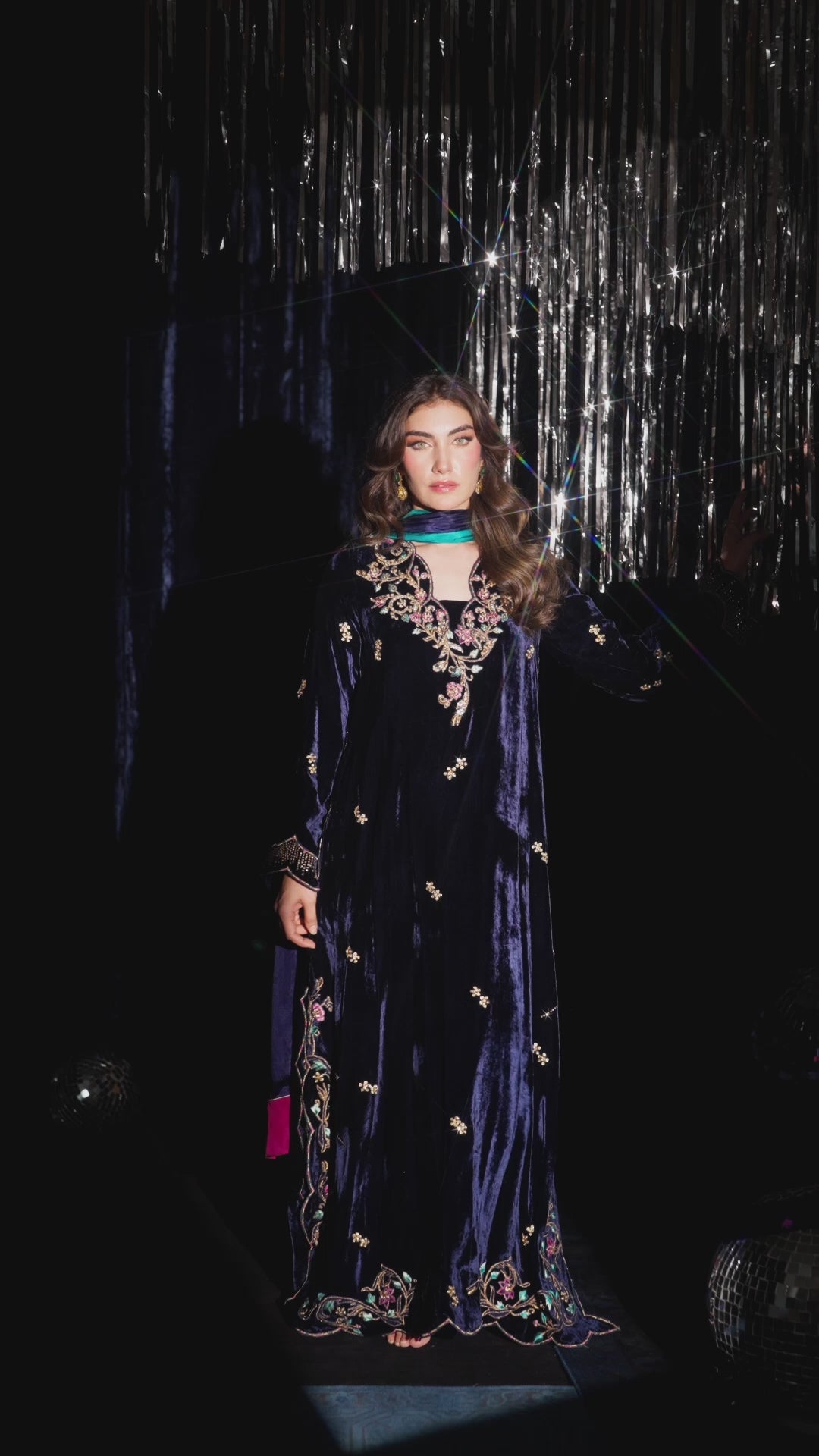 An effortlessly elegant statement — this blue kaftan-cut kurta is adorned with intricate zardozi and resham embroidery in striking shades of teal and pink, creating a beautifully balanced contrast. The fluid silhouette drapes gracefully, offering a perfect blend of comfort and festive sophistication. Paired with a medium silk blue dupatta finished with accents of pink and teal, and a matching raw silk izaar, this ensemble embodies refined charm with a contemporary edge.