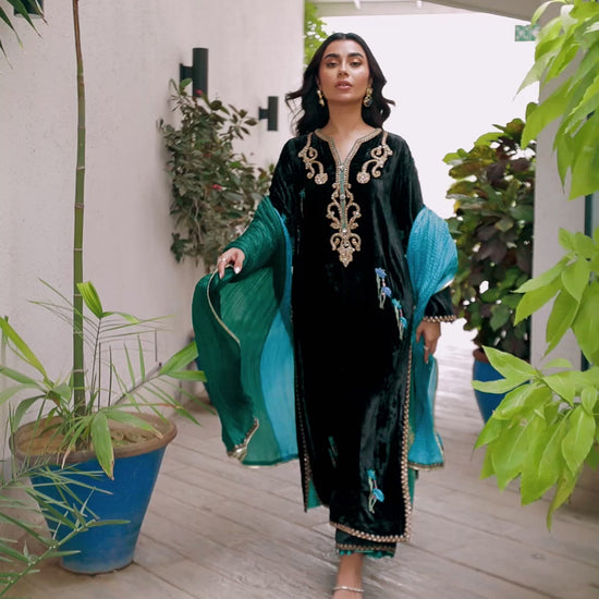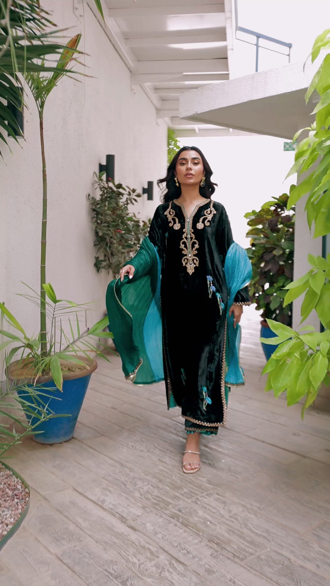 A gorgeous, deep onyx kurta cut from plush velvet with a round with ‘V’ neckline intricately hand embellished with kora and dabka in regal gold. The stunning back has a lovely detailed neckline, sure to have all eyes on you at any occasion this festive season. Emerald and teal blooms dot the front and sleeves of the shirt to provide a