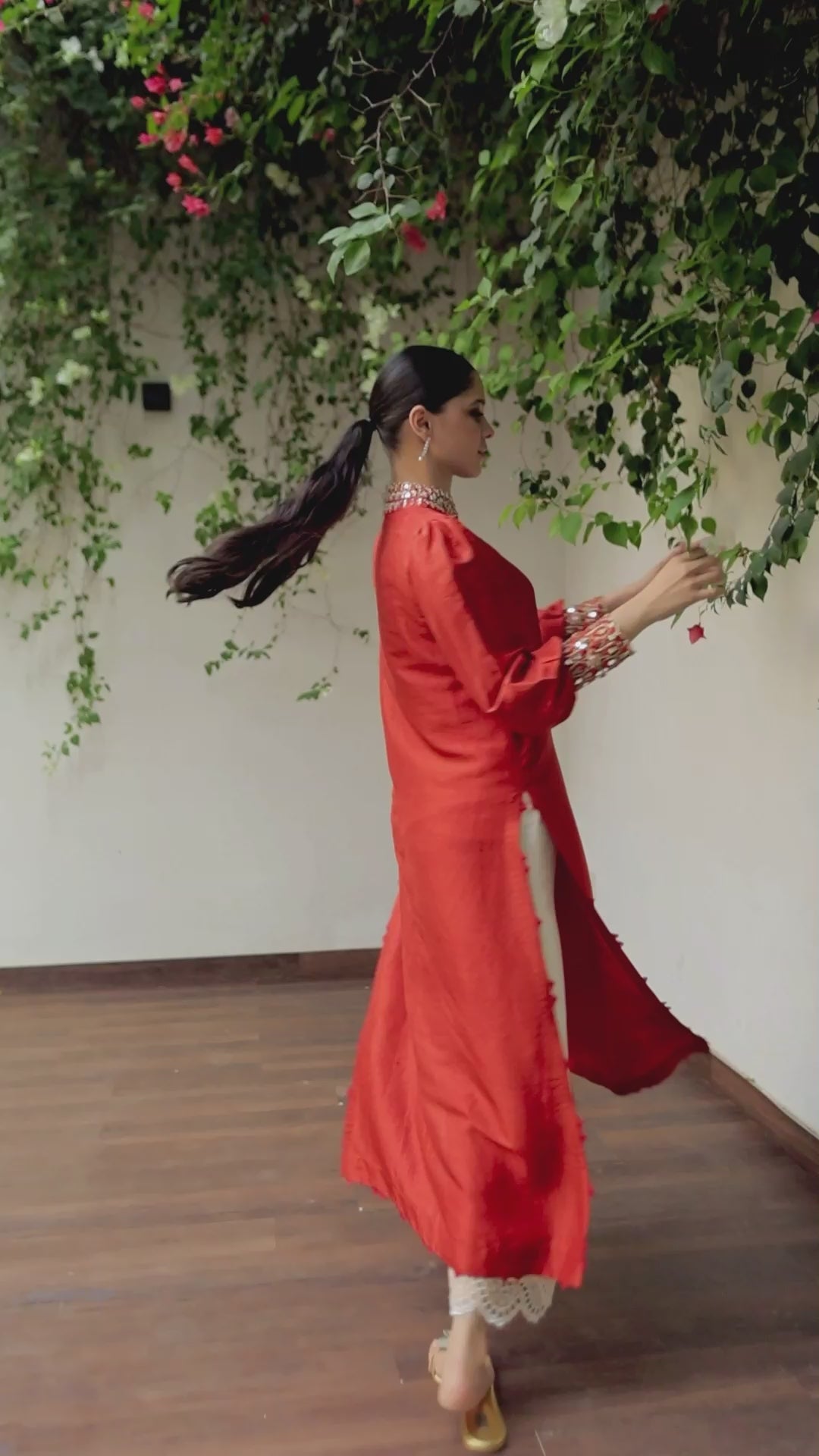 The thigh high slits on the sides, gives enticing glimpses of the absolutely flattering wide leg pants.