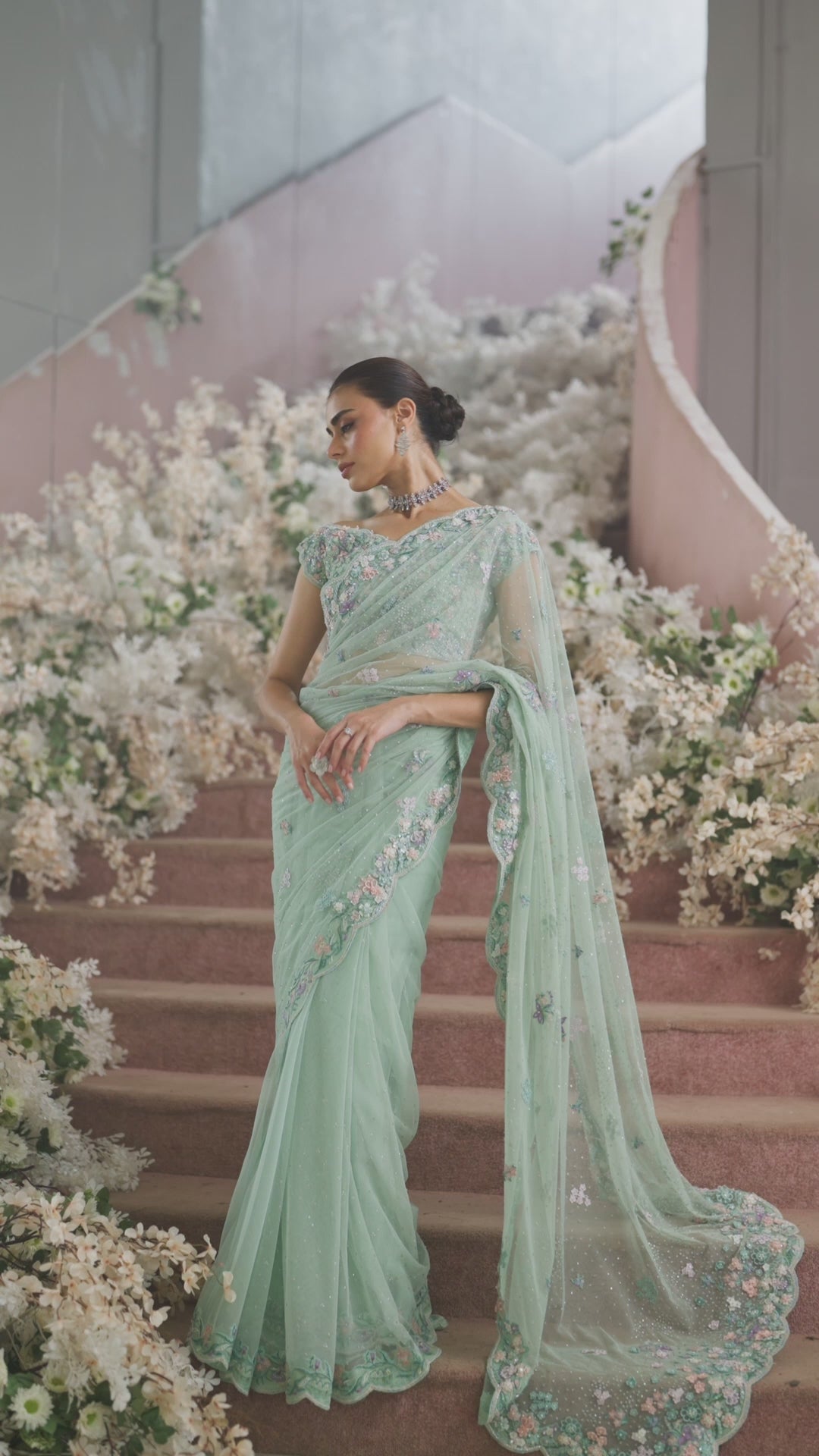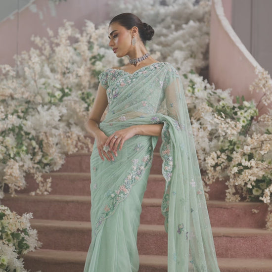 A breathtakingly beautiful saree that draws you in with its exquisitely intricate embroidery. On a canvas of dreamy aqua tulle, 3-D flowers bloom delicately amongst soothing green canvas, as bedazzled butterflies float in between.Subtly shimmering sequins encrusted on the entirety of the saree add to the truly ethereal look.