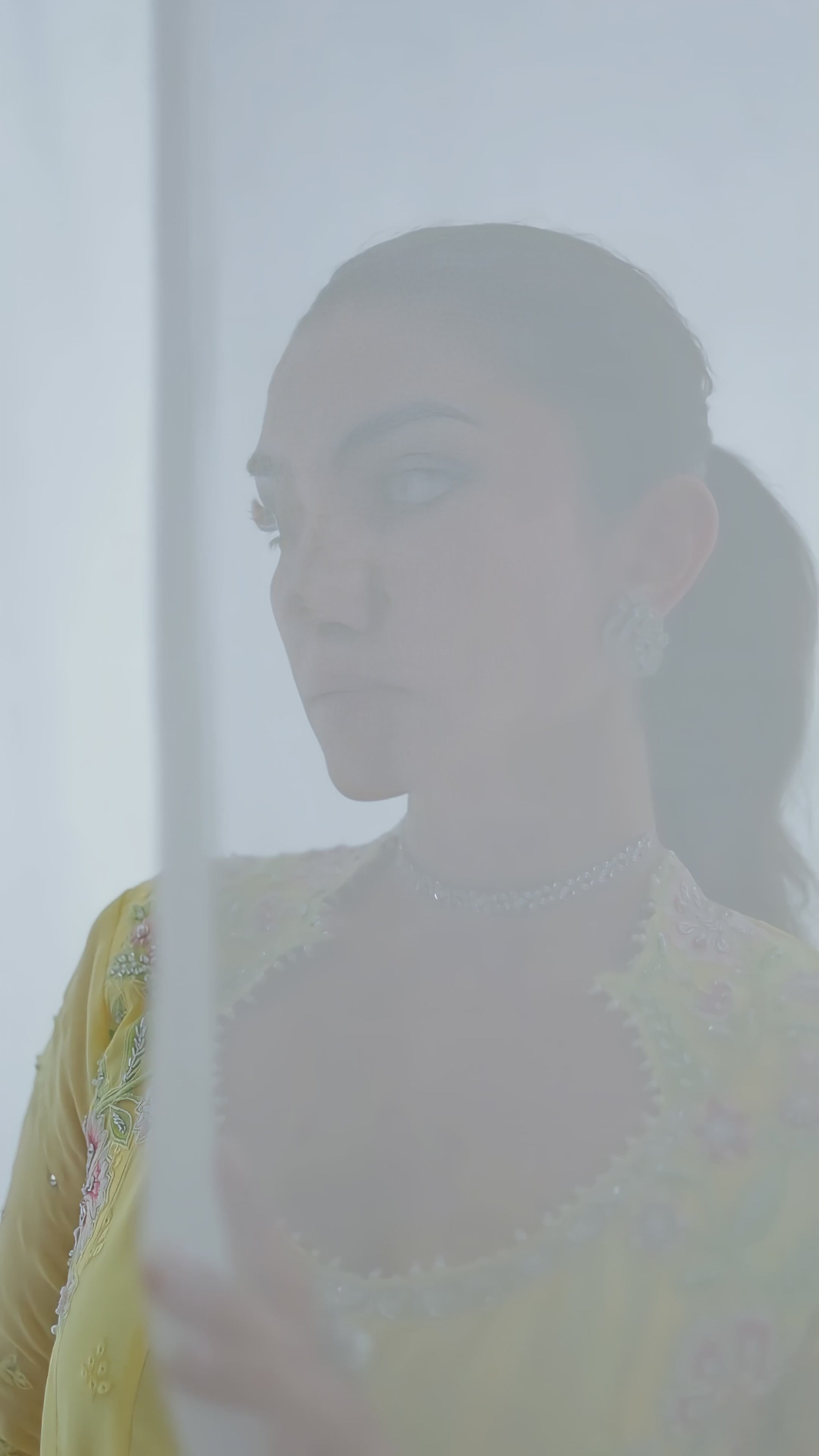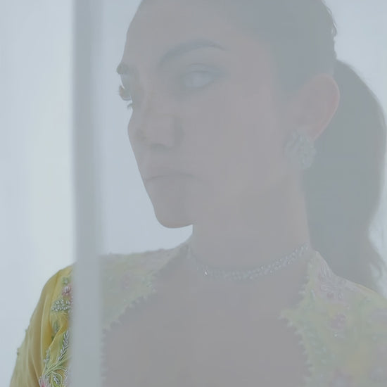 Butter-yellow elegance, redefined. Cut from pure raw silk, this kalidar features sheer organza sleeves and delicate hand embellishment with pearls and Swarovski crystals. The look is anchored with a structured izaar detailed at the hem and completed with a diaphanous pearl-strewn dupatta. A refined yet statement-making choice for wedding season.
