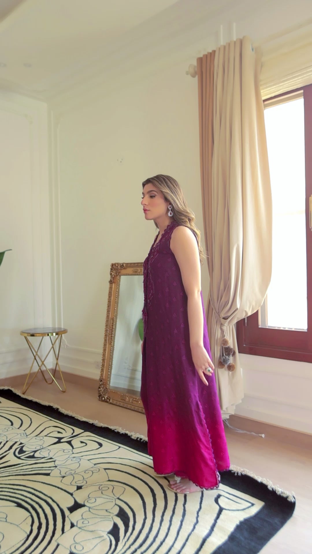 Discover an elevated sense of style with this unique ombre in the captivating shade of wild berry that subtly transitions into the most beautiful hues of magenta. The high collared V neckline is gorgeously adorned with schiffli embroidery and dotted with sequences, beads, tassel and 3D floral embellishments. With schiffli borders in the incut sleeve and lace detailing all over, this embroidered pure raw silk long shirt embodies the art of looking effortlessly chic. Paired with a raw silk trouser with lace details this look with its vibrant blooming hues is the most eye-catching ensemble of the season.