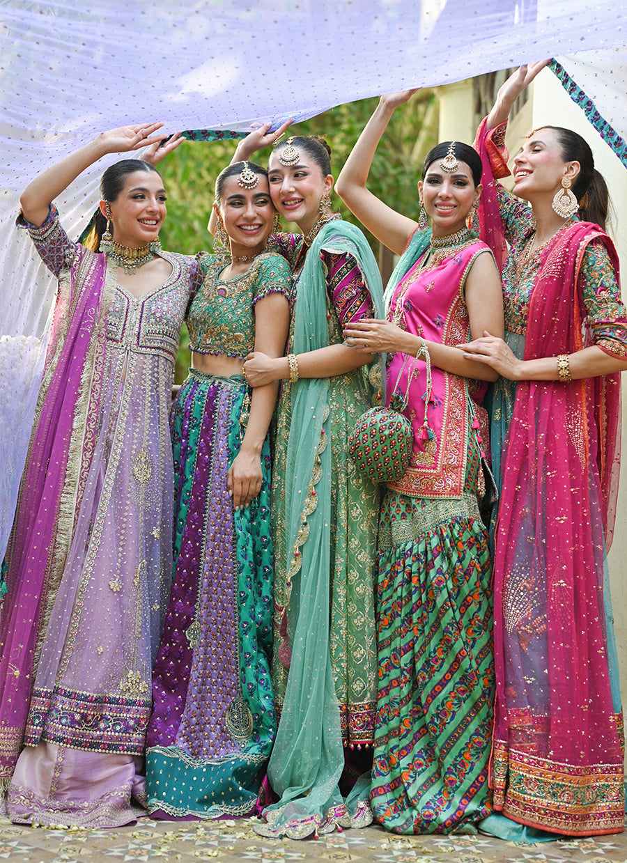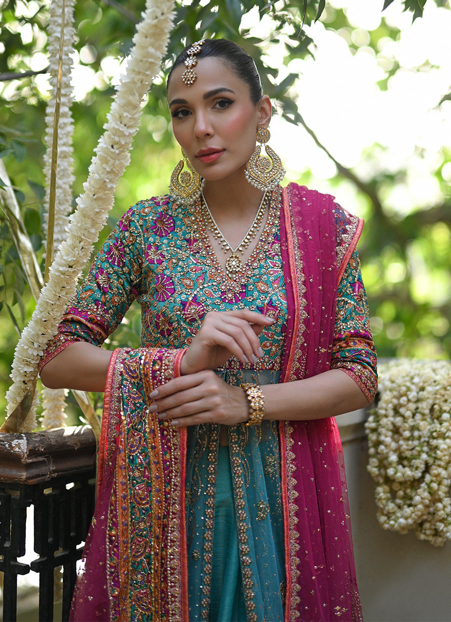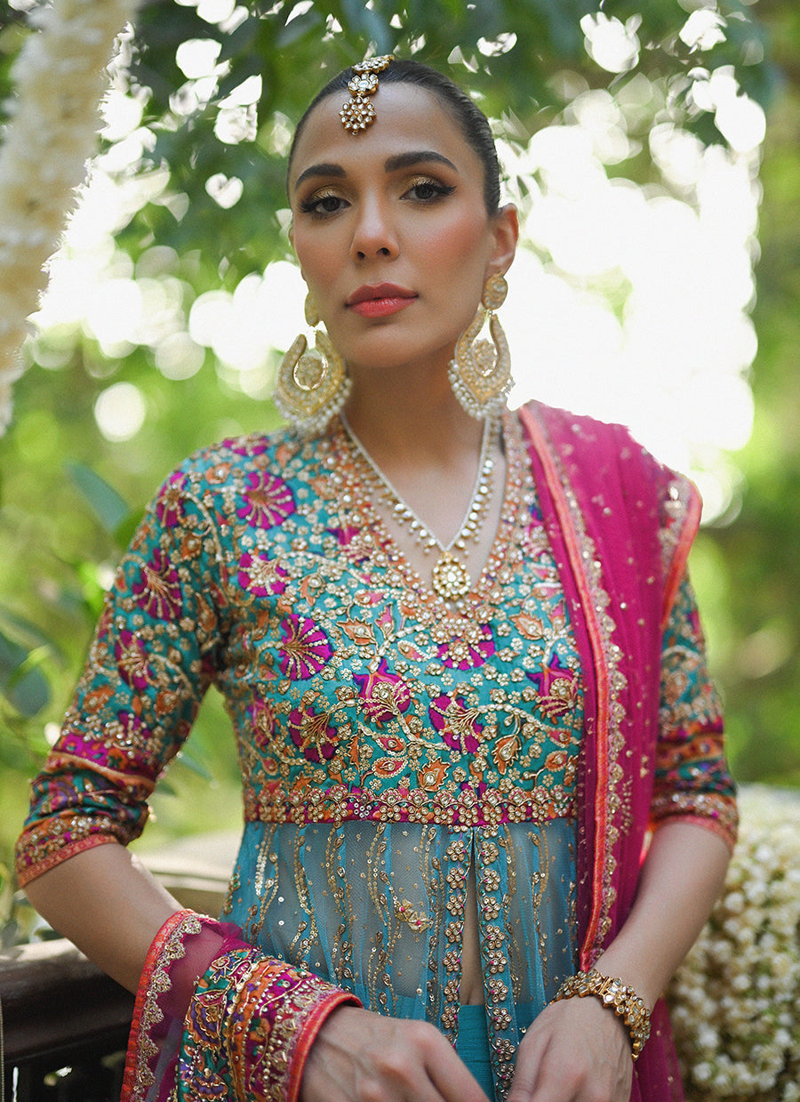 Our most loved shade to celebrate in, this gorgeous sea green kalidaar is the epitome of a showstopper. The kalidaar features a block-printed bodice adorned with highly intricate handwork. The sheer net kalidaar is beautifully complemented by a zari silk lehenga that shines through, creating a dreamy, ethereal effect. The ensemble is completed with a deep pink dupatta, adorned with bursts of heavily embellished sequins and an embellished block-printed border, giving it an unforgettable festive look. This outfit perfectly combines traditional craftsmanship with contemporary style, making it ideal for any celebration.