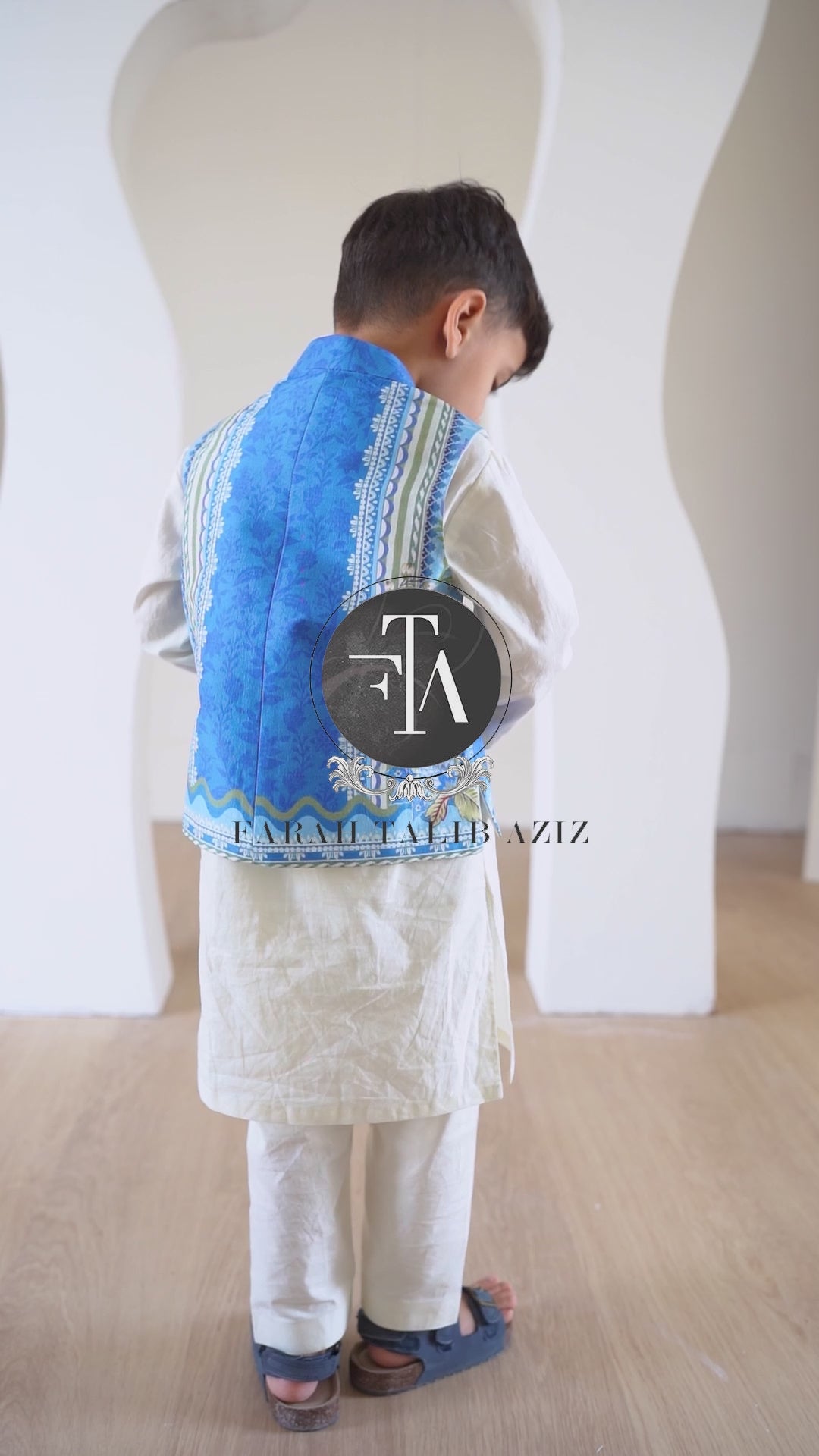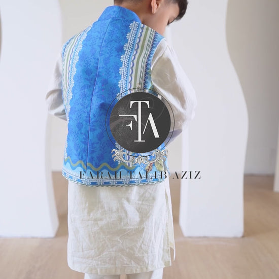 Crafted from luxurious raw silk, this slate blue waistcoat is a stylish statement piece for young boys at formal events. The rich, slate blue tone is enhanced by a delicate, all-over print that adds subtle depth and visual interest. With its smart, tailored silhouette, sleek button closures, and clean lines, the design delivers a sharp, contemporary finish. Perfectly paired with an ivory kurta pajama, this waistcoat blends classic sophistication with a hint of youthful flair—ideal for making an impression at any special occasion.