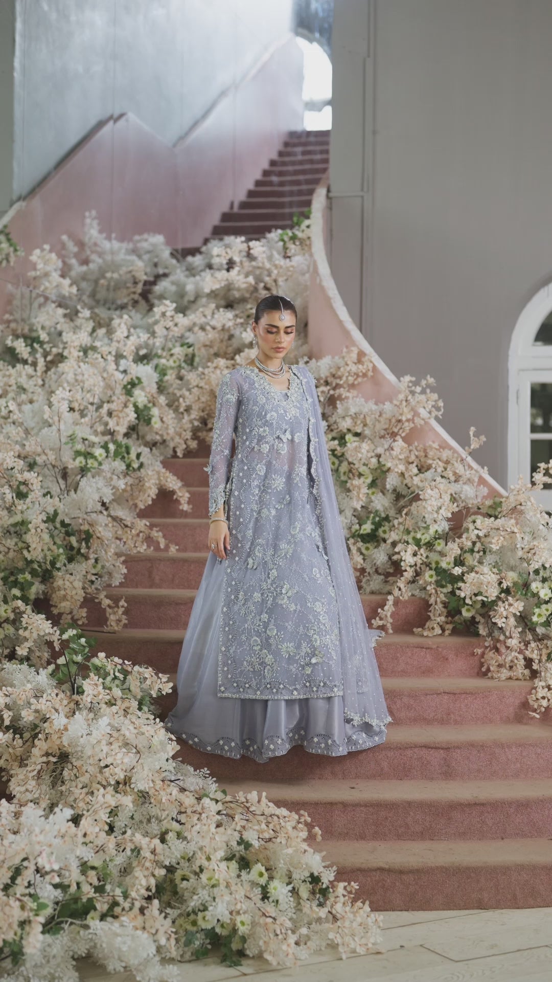 It is paired with a pure silver zari lehenga, featuring a richly hand embroidered border. The look is completed with a pure tulle dupatta, trimmed with an intricately embellished scalloped border and sequins sprinkled across the surface—perfectly tying together elegance with a touch of magic.