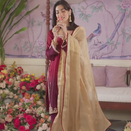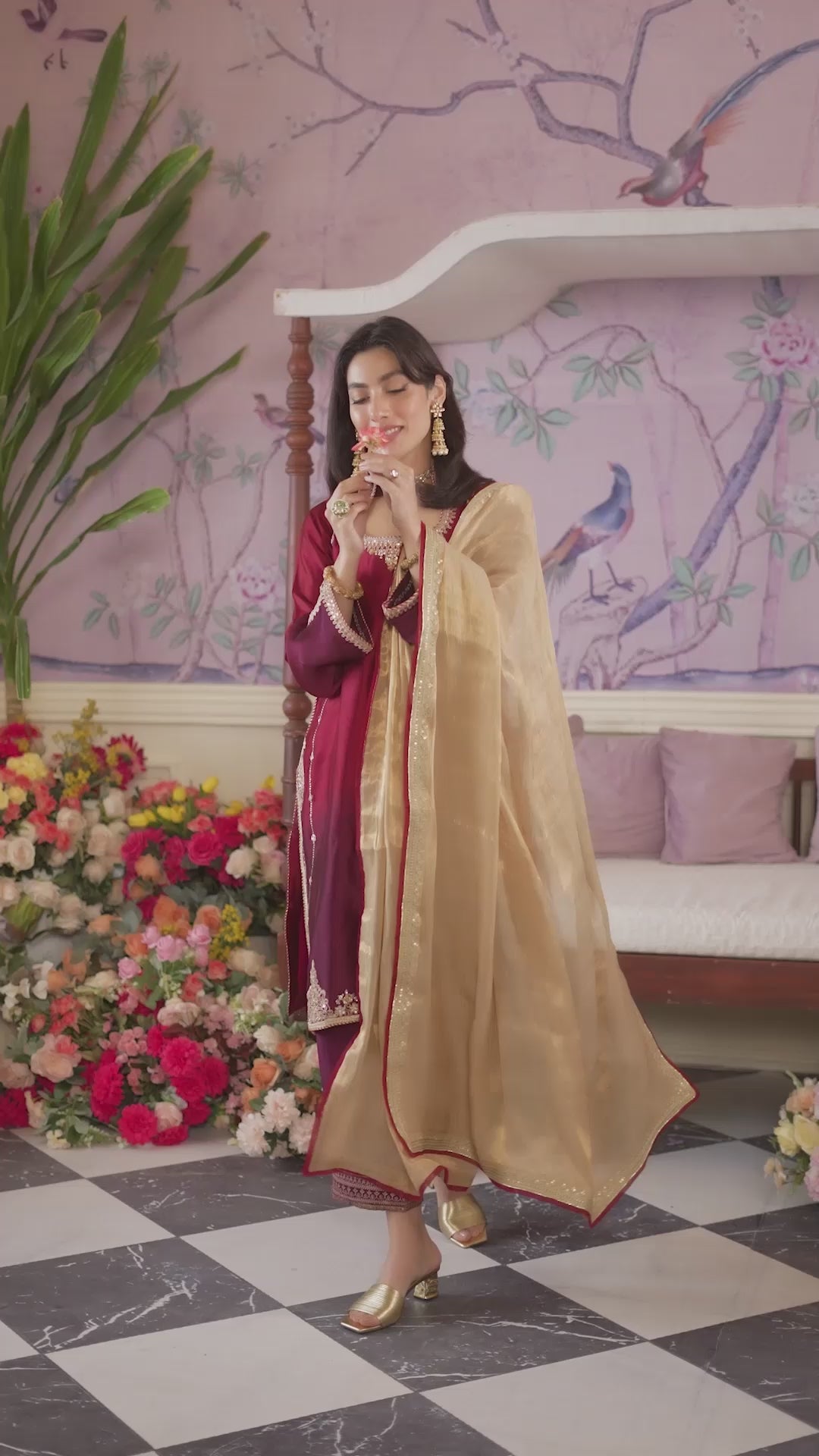 The color of the season will be the showstopper at any party. Keeping it simple with the two-toned shirt with hand embellishment on the shirt with matching maroon culottes with a gold border. Paired with a beautiful, pure zari silk dupatta to add a contrast to the bold color.